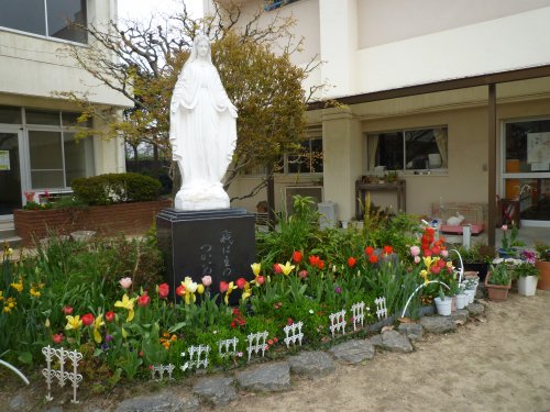 マリア様のそばには、赤や黄色や桃色のチューリップの花がきれいに咲いたよ。