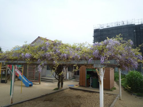 きれいだったさくらんぼの花が散って少し寂しいなぁと思っていましたが、今新しい緑の葉っぱの中に小さなさくらんぼの実がなりはじめています。坂の上の菜の花や園芸部のお母様が大切に植えてくださったお花、砂場の上の藤の花も満開で、きれいなお花たちが子どもたちの入園・進級をお祝いしてくれているかのようです!