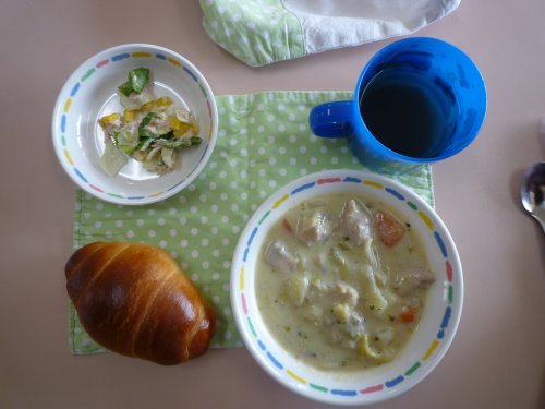 今日のメニュー:ロールパン、野菜とシーチキンのサラダ、チキンと野菜の豆乳クリーム煮