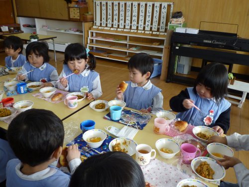 今日のメニュー:ロールパン、豆入りキーマカレー、フルーツポンチ白玉入り