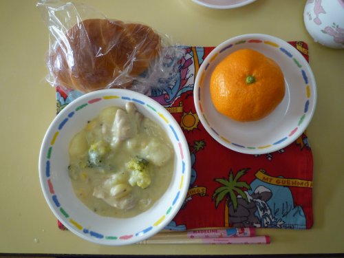 今日のメニュー:ロールパン、鶏肉と野菜の豆乳クリーム煮、みかん