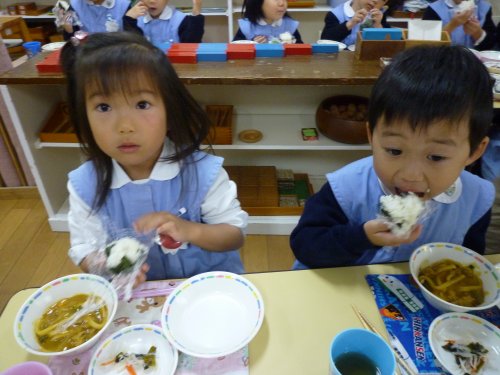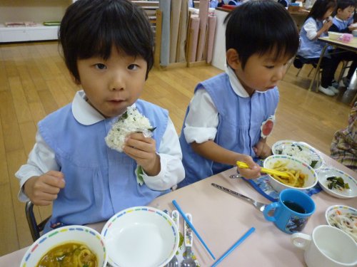 今日のメニュー:わかめおにぎり、カレーうどん、酢のもの