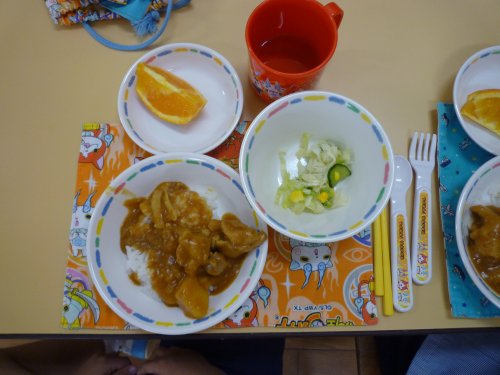 今日のメニュー:チキンカレー、キャベツとキュウリの酢の物、オレンジ