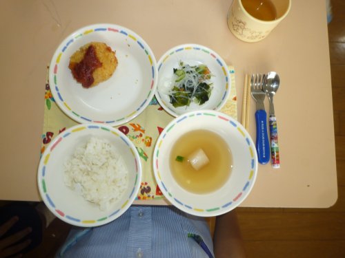 今日のメニュー:ご飯、みそ汁、ポテトコロッケ、きゅうりとわかめの酢もの