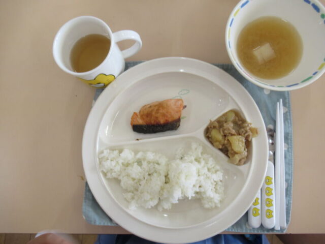 ご飯、魚のみそマヨネーズ焼き、じゃがいもと豚肉の煮物、みそ汁